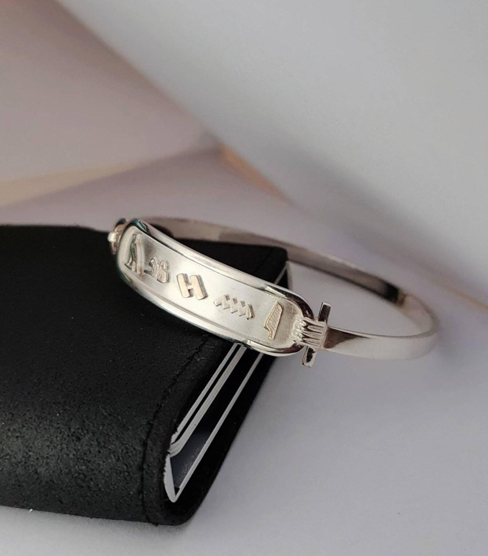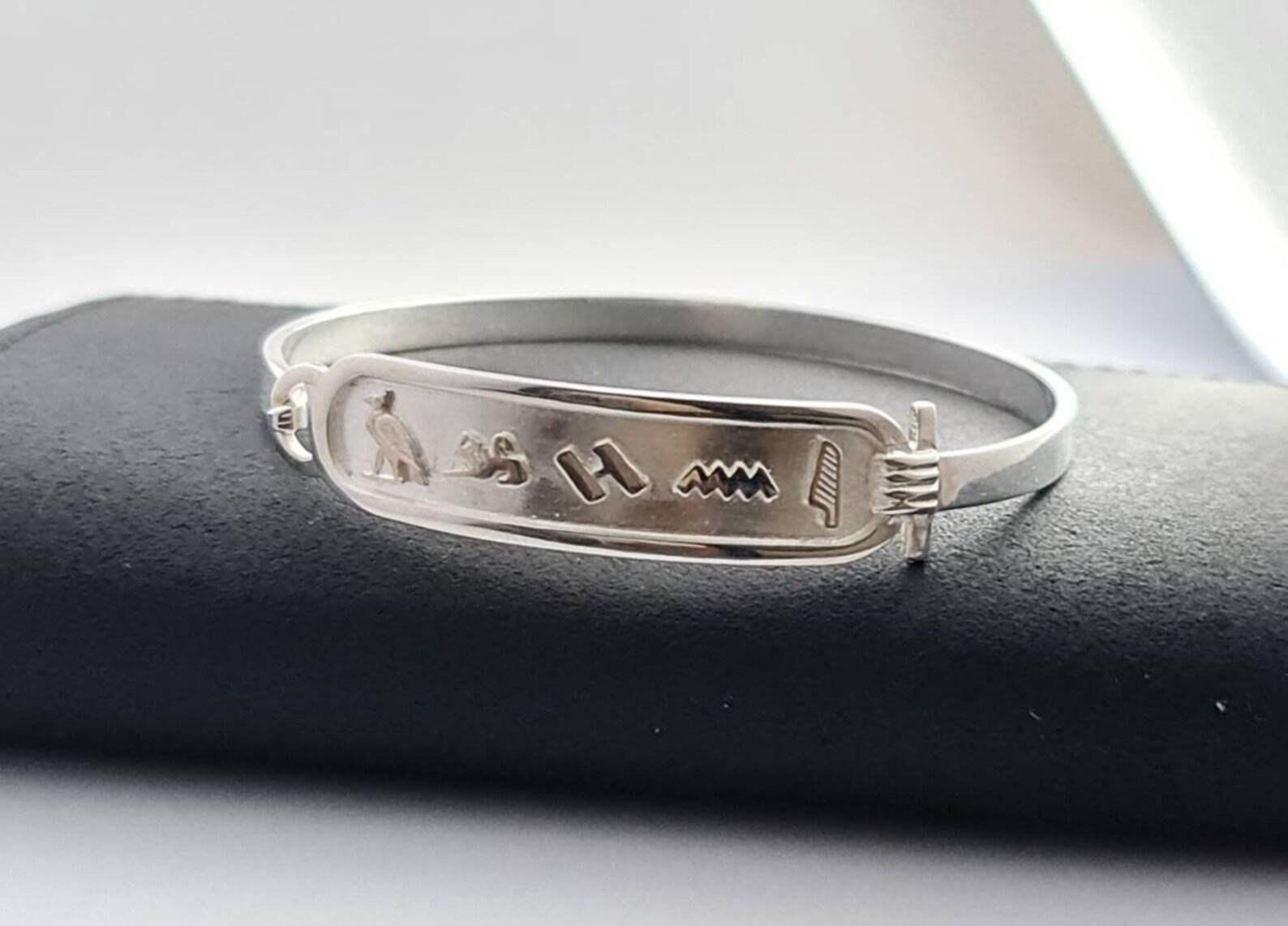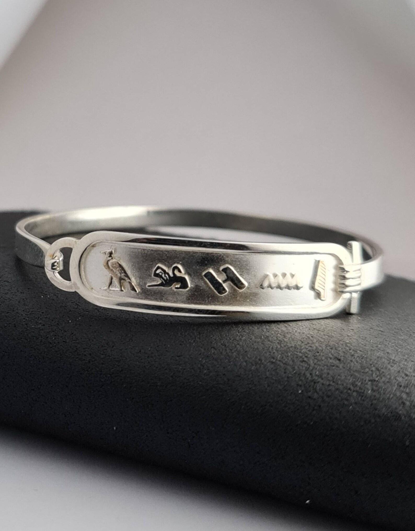 This sterling silver cartouche bracelet features your chosen name or word rendered in ancient Egyptian hieroglyphic symbols, framed within the classic cartouche form traditionally used to emphasize identity and distinction.